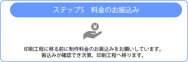 印刷工程に移る前に制作料金のお振込みをお願いしています。振込みが確認でき次第、印刷工程へ移ります。